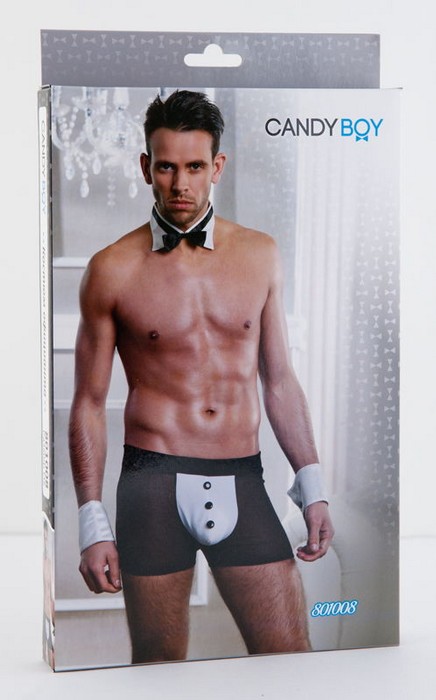 Стильный костюм джентельмена Кэнди Бой. Чёрные шорты имеют декоративную белую вставку с пуговицами, задняя часть шортов изготовлена из прозрачной ткани, которая открывает соблазнительные и упругие ягодицы. Воротник-галстук на застежке-липучке, манжеты на кнопке дополняют ваш яркий сексуальный образ. Пришло время для экспериментов, подарите своей избраннице незабываемые эмоции и ощущения.