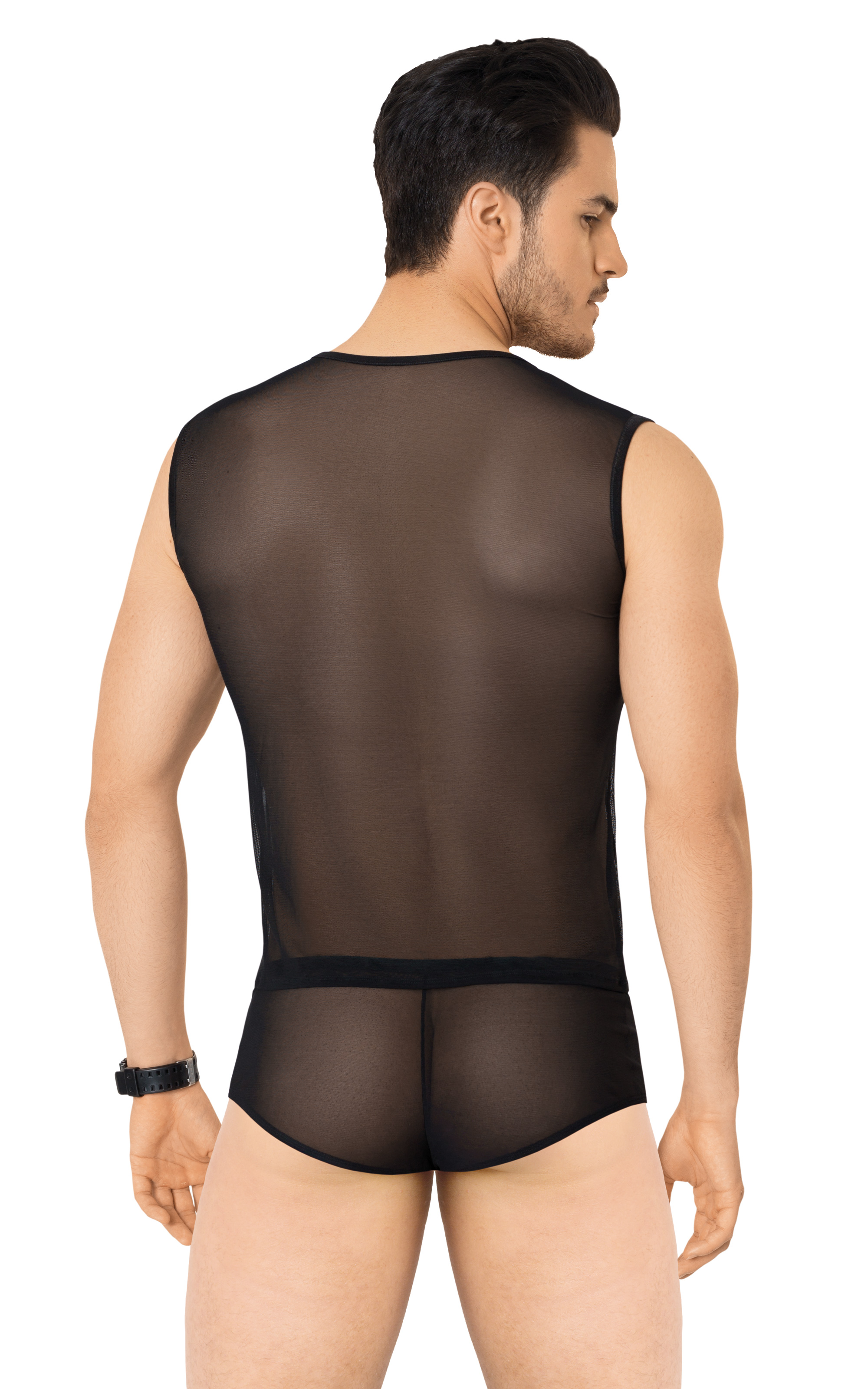 Экстравагантный комплект для смелых мужчин. Футболка и шорты выполнены из крупной эластичной сетки. Задняя часть трусов выполнена из мягкой мелкой сеточки, спереди вставка из такой же сеточки.