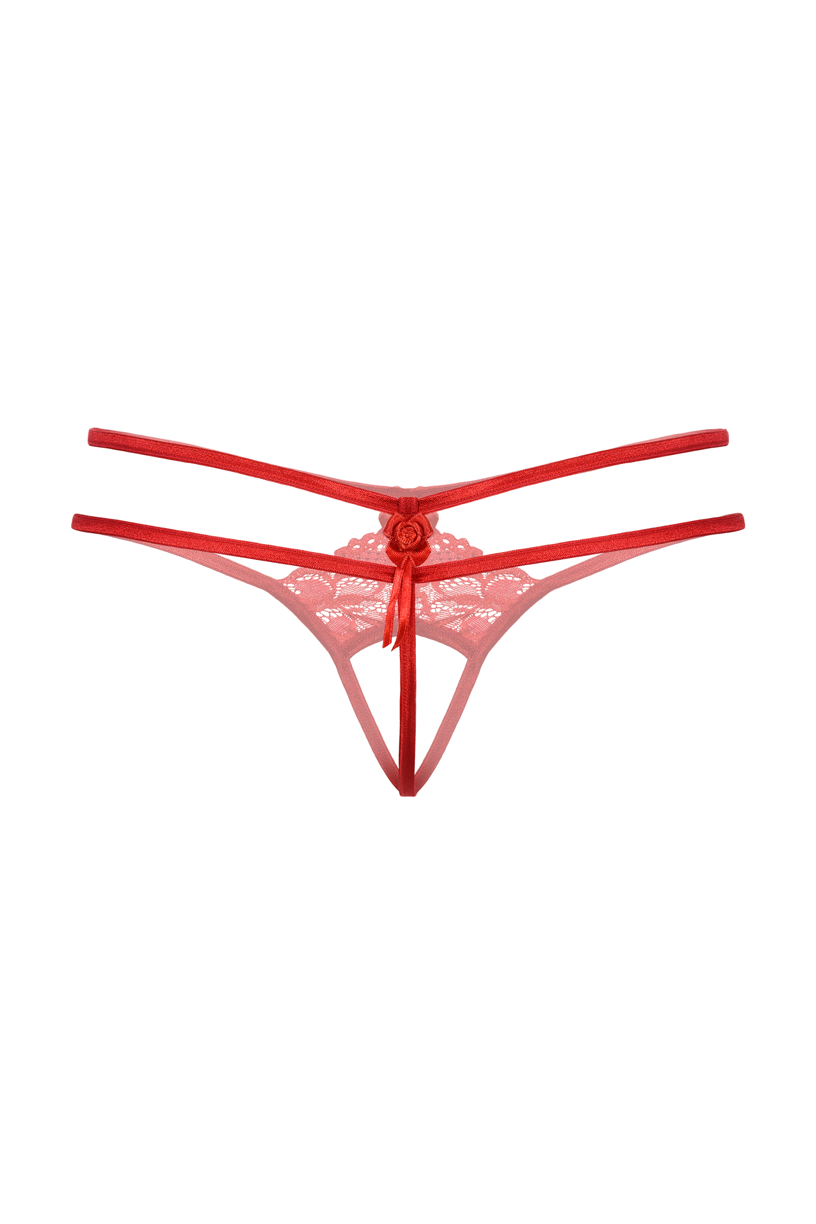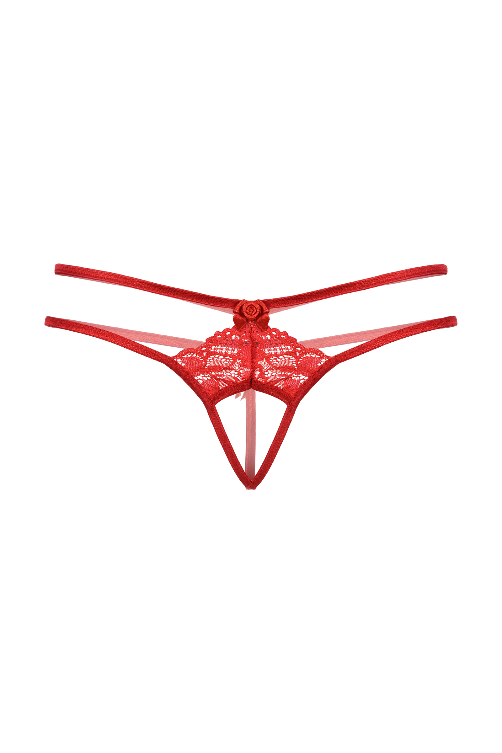 Кружевные стринги с открытым доступом. Спереди и сзади декорированы маленькими бантиками. Оригинальное сочетание нежного кружева и переплетения тесьмы.